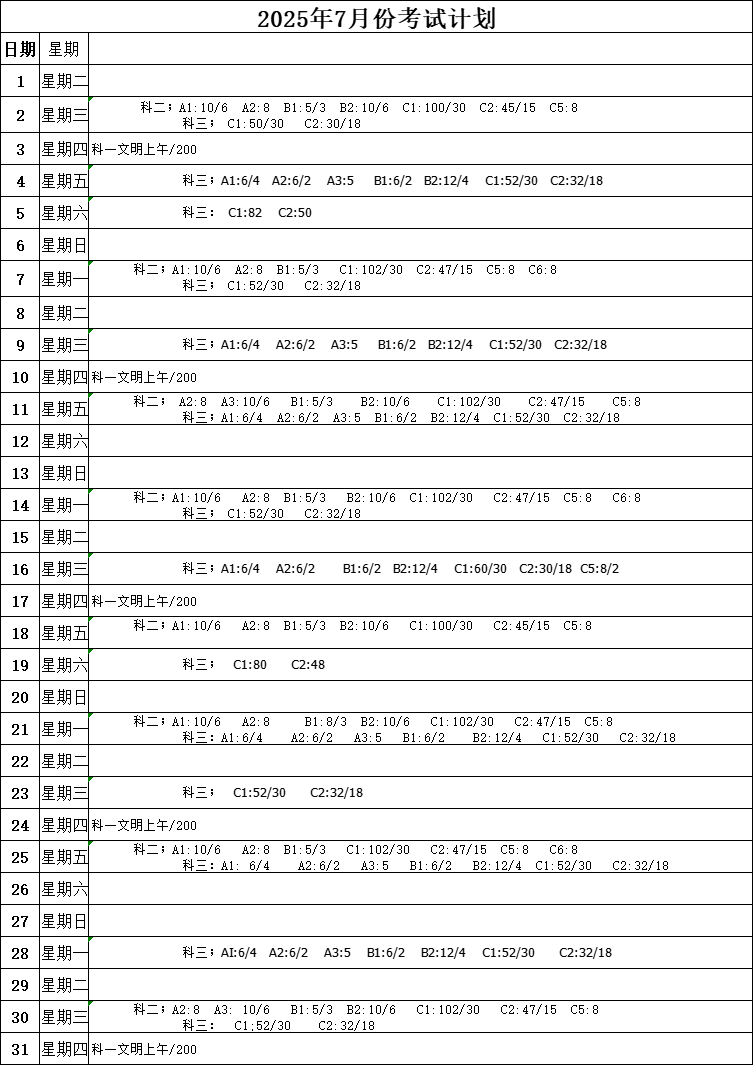 2025年07月份考試計劃